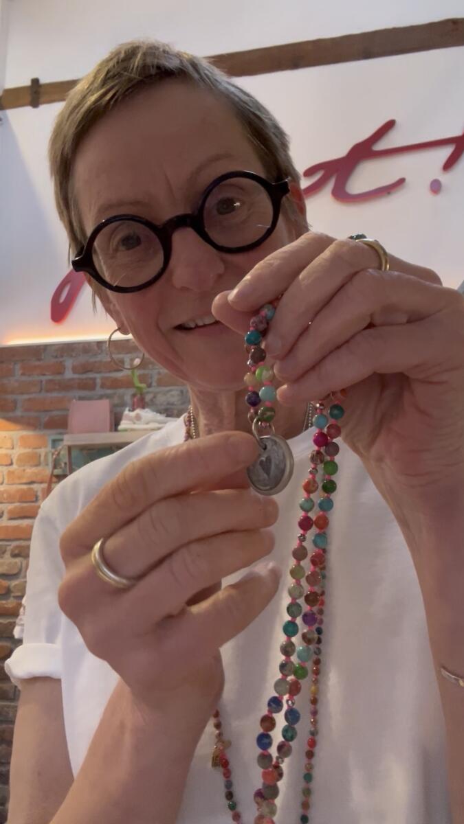 sie trägt einen Anhänger mit einem kleinen eingefassten Herz ...